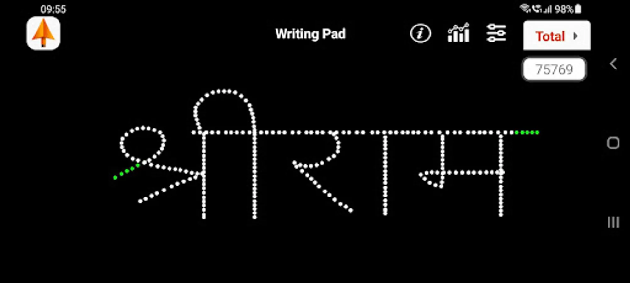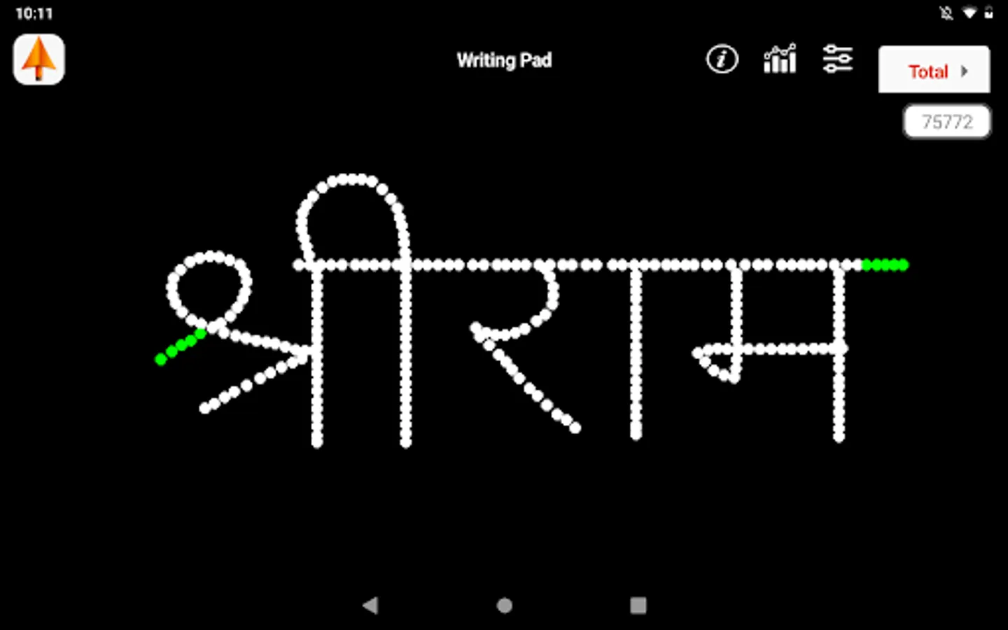 In sanathana dharma, it is firmly believed and experienced that meditating on a character you love and aspire-to-be leads gradually to attaining the qualities of the character and ultimately becoming the one being meditated upon. Prior to the digital era, meditators used books having pre-printed cells on every page to hand-write ‘Sri Rama’ script in their own language and mark the completion of a book as a milestone. Writing a number of such books to complete a RamaKoti (1 Crore or 10 Million times) was considered a lifetime dream and achievement. Our endeavour is to make this lifetime dream of meditators even easier with this RamaKoti App especially when they are digitally inclined in this fast-paced world - yet trying to retain the experience of writing the namam (the name) as our ancestors used to do using a book. This is also to remind the newer generations about this age-old practice and encourage them to act with their fingertips. Let’s together reverberate the planet with ‘Sri Rama’ namam every moment.
