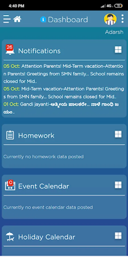 SMN Parent App Powered by VidyaLekha provides a simple, powerful App for parent-teacher collaboration. Parents, now get all updates like Homework, Notices, Attendance and Fee reminders through app and push notifications, saving your valuable time so that you can concentrate on the other important tasks. It's advanced and flexible reporting platform helps you to get in-depth analysis of the result data. Screens and functionalities designed to get good user experience and high usability of the product.