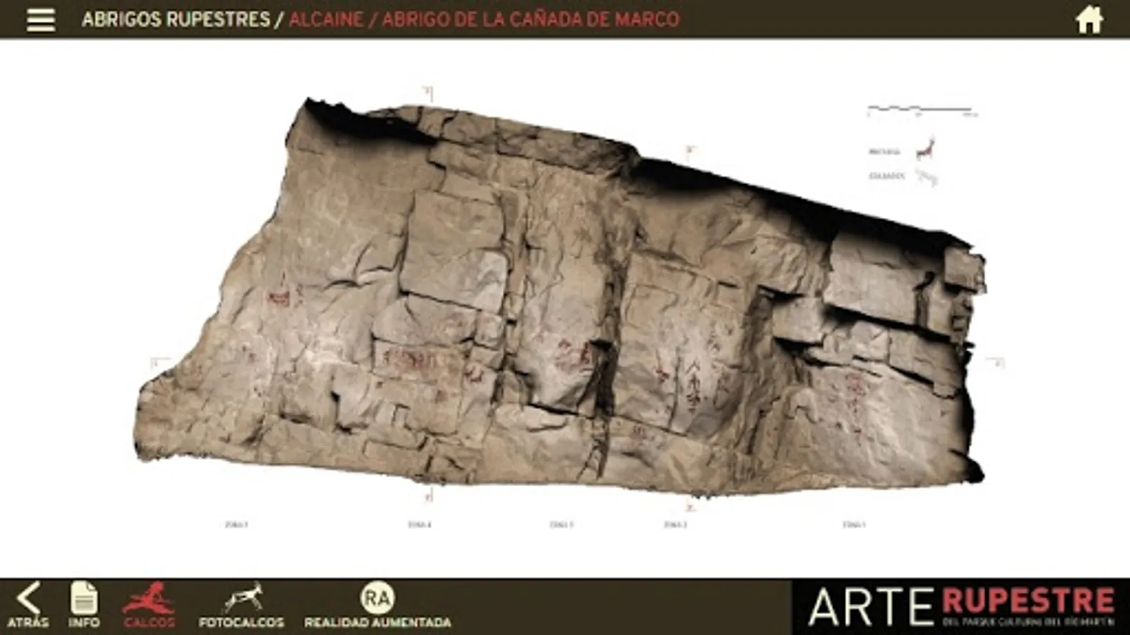 The application includes explanations of the history and discoveries, accesses and a detailed description of the cave shelters, the original traces of the paintings and engravings and an Augmented Reality module from which the images of the cave paintings will appear adapted according to the position and the Visitor's distance to the original pictorial scenes preserved in the rock.