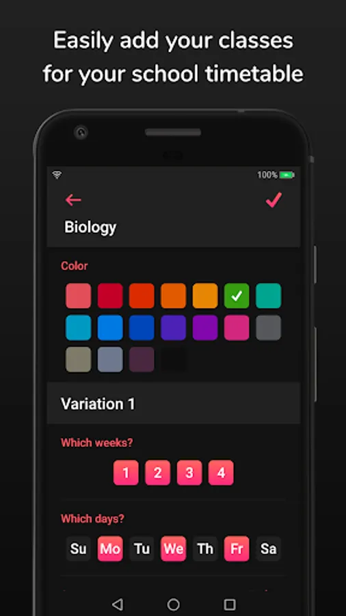 - If you have a very mixed up schedule with the same class at different times on different days, no need to add the same class multiple times. Simply add a variation and choose the days and time.