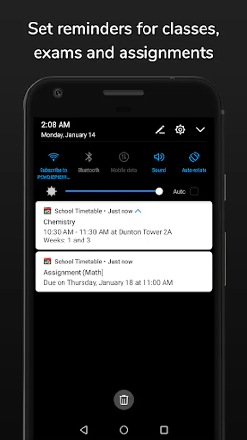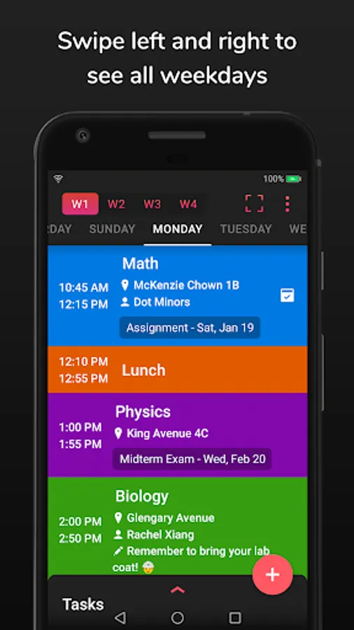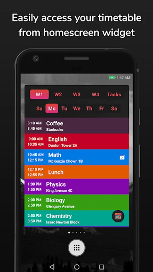 School Timetable is the most easy to use, yet versatile scheduling, planning and organizing app for students of school, college or university. Easily keep track of your weekly school schedule and events, meet deadlines for homework assignments, exams and quizzes in this beautiful tracker accompanied by a homescreen widget. Check out the following features which makes School Timetable the most complete schedule organizer app for students: