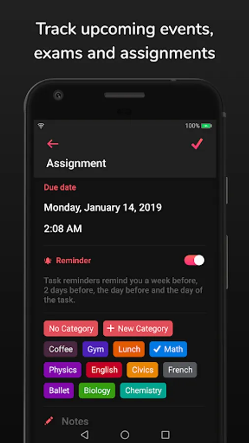 - Setup reminders for upcoming events, exams and homework assignments. These reminders will remind you a week before, 2 days before, 1 day before and the morning of the event to keep you on top of your game!