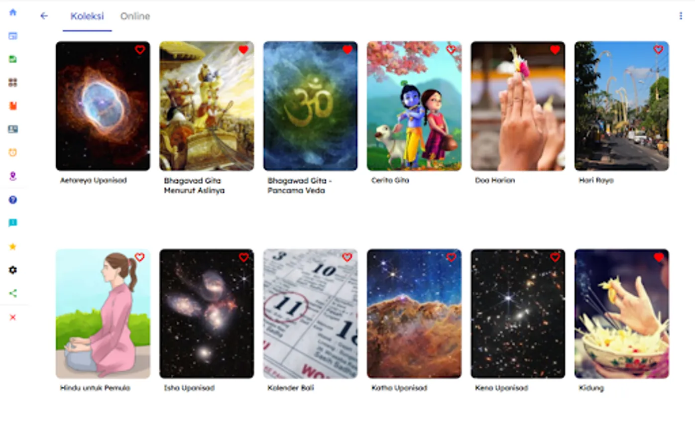 In the form of a collection of Hindus' daily mantras/prayers which include Tri Sandya, Gayatri, Panca Sembah, Prayers for holidays, offering saiban/ngejot, and other prayers. Song for various events. Various Hindu holidays. Indonesian Bhagavad Gita. Sarasamuscaya in Indonesian. Collection of Bhagawad Gita Stories for Children and Beginners. A collection of articles about learning Hindu teachings (online). Several Upanisad books in Indonesian: Aetareya, Isha (Isa), Katha and Kena Upanisad. Including various Hindu religious textbooks for elementary, middle school to high school / vocational students.