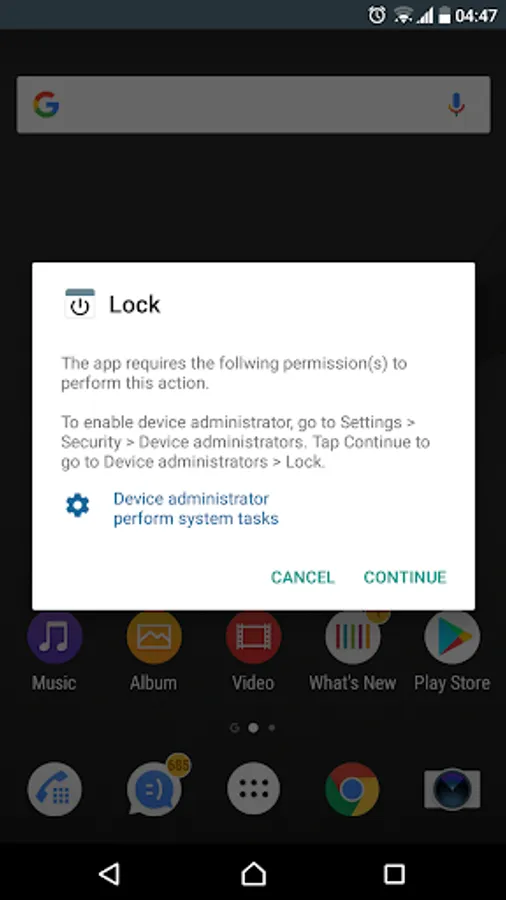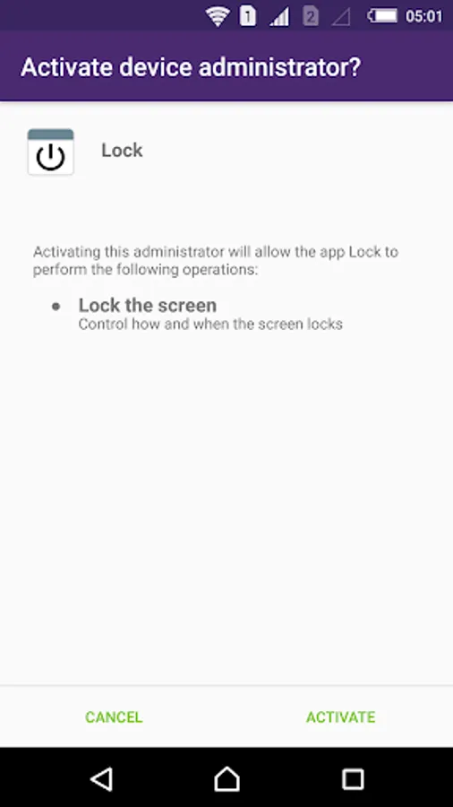 Lock the screen – Lock the device to mimic the power button functionality. It can be disabled via Settings > Security > Device administrators > Lock. It can also be done via Uninstall small app.