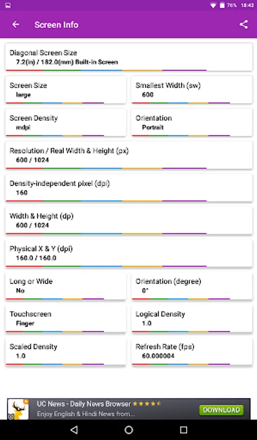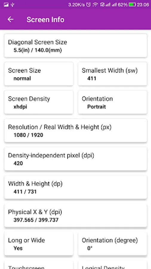 • Screen Information [all the details regarding device screen, screen size, resolution, refresh rate etc.]