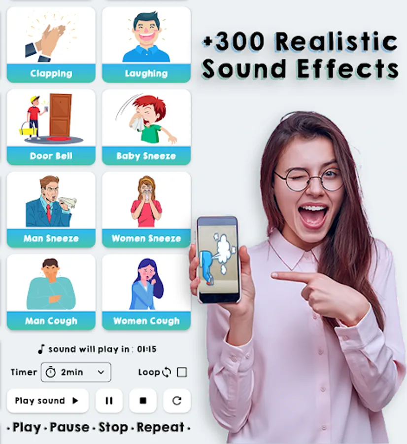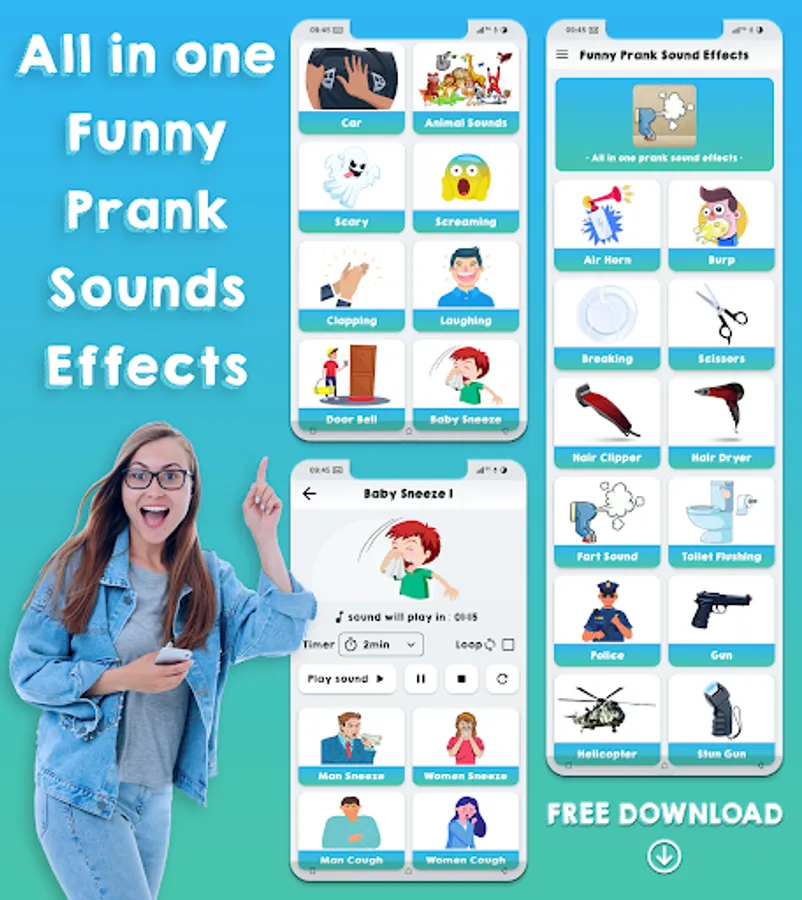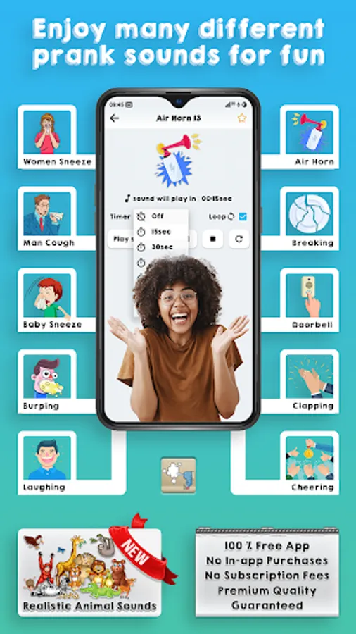 ⏱️ Timer & Loop of prank sound effects, turn on countdown timer and the sound will keep playing as long as you want.