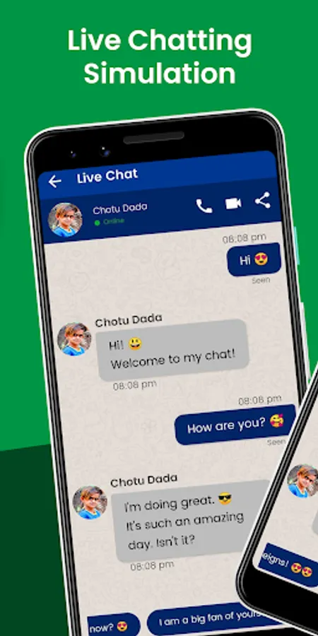 Chotu Dada Fake chat and Video Call can be used for prank a friend. An incredibly fun camera adventure with Chotu Dada calling you a Simulation.