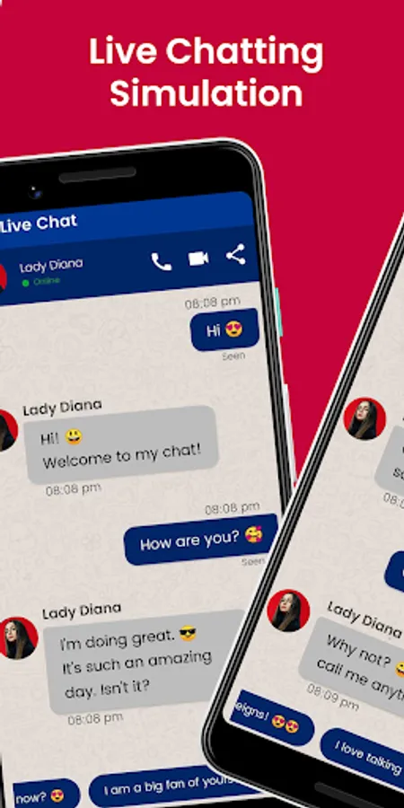 Using this application of lady diana fake chat present with high video qualities and many videos available. диана- это приложение для моделирования видеозвонков и текстовых сообщений, ориентированное на фанатов. Donwload now this correspondence of lady diana video call game simulation and enjoy the experience be able to exchange communication fake chat with lady diana messenger. This is not Lady Diana who calls, but a simulation of fake calls and fiction. This video call and prank chat live with lady diana will be featured with other artists, such as :
