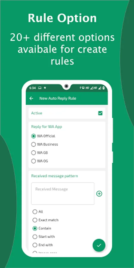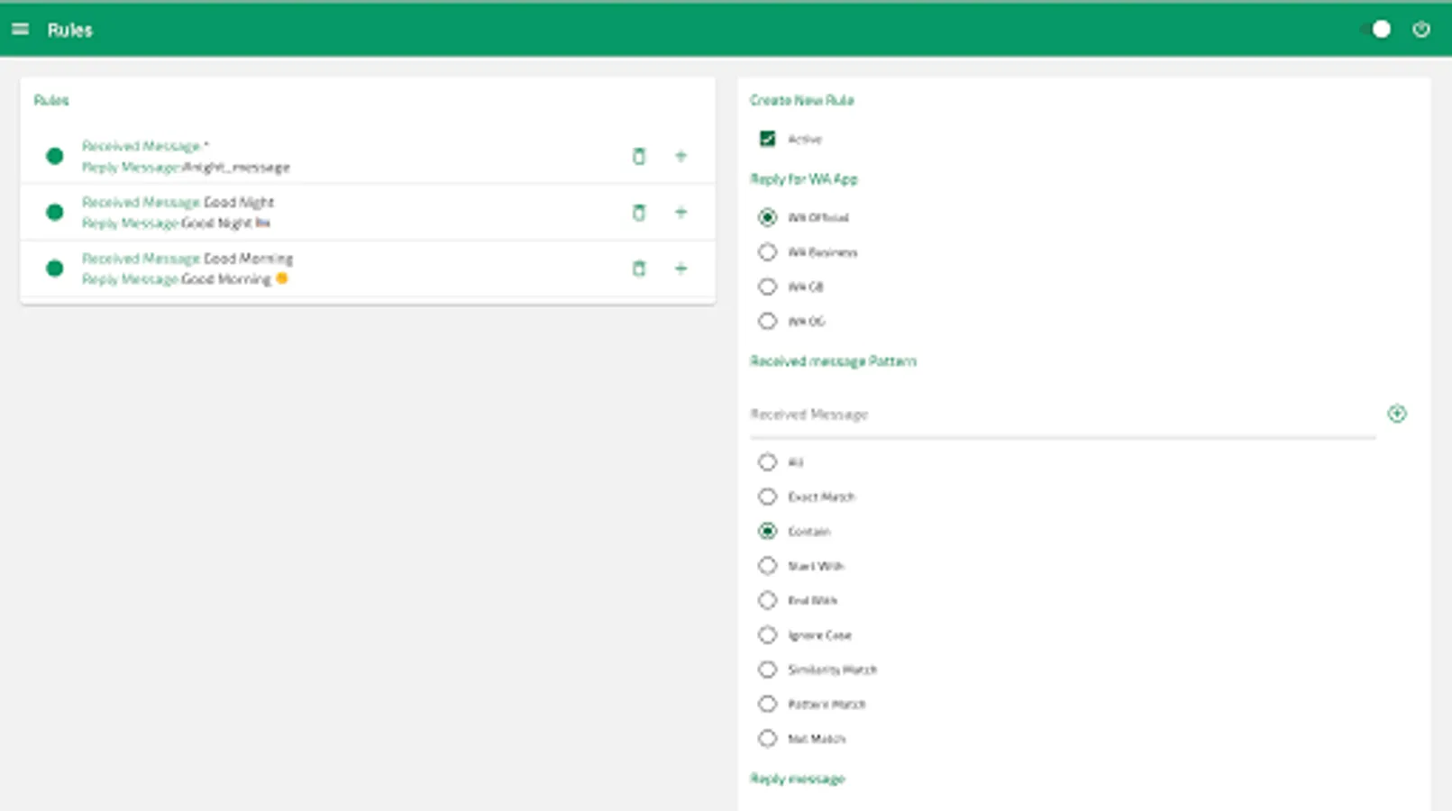 👉 Create custom reply message patterns like Exact match, Contain, Start with, End with and many more...