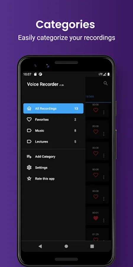 categorize your audio files easily, you can create multiple custom categories like voice notes, meetings, lectures, music and etc., later on you can assign audio files to each of your custom categories.