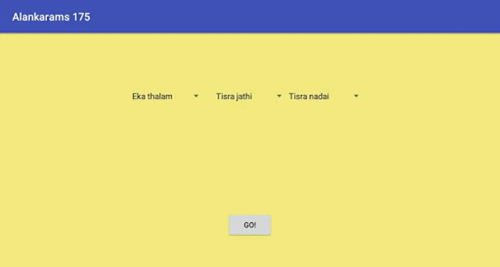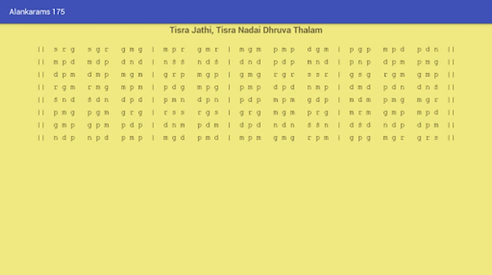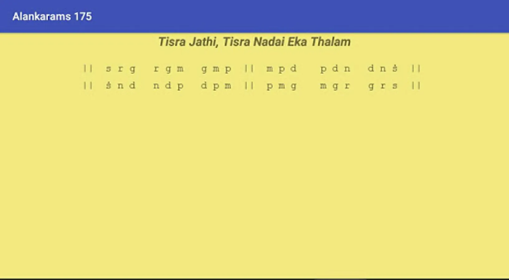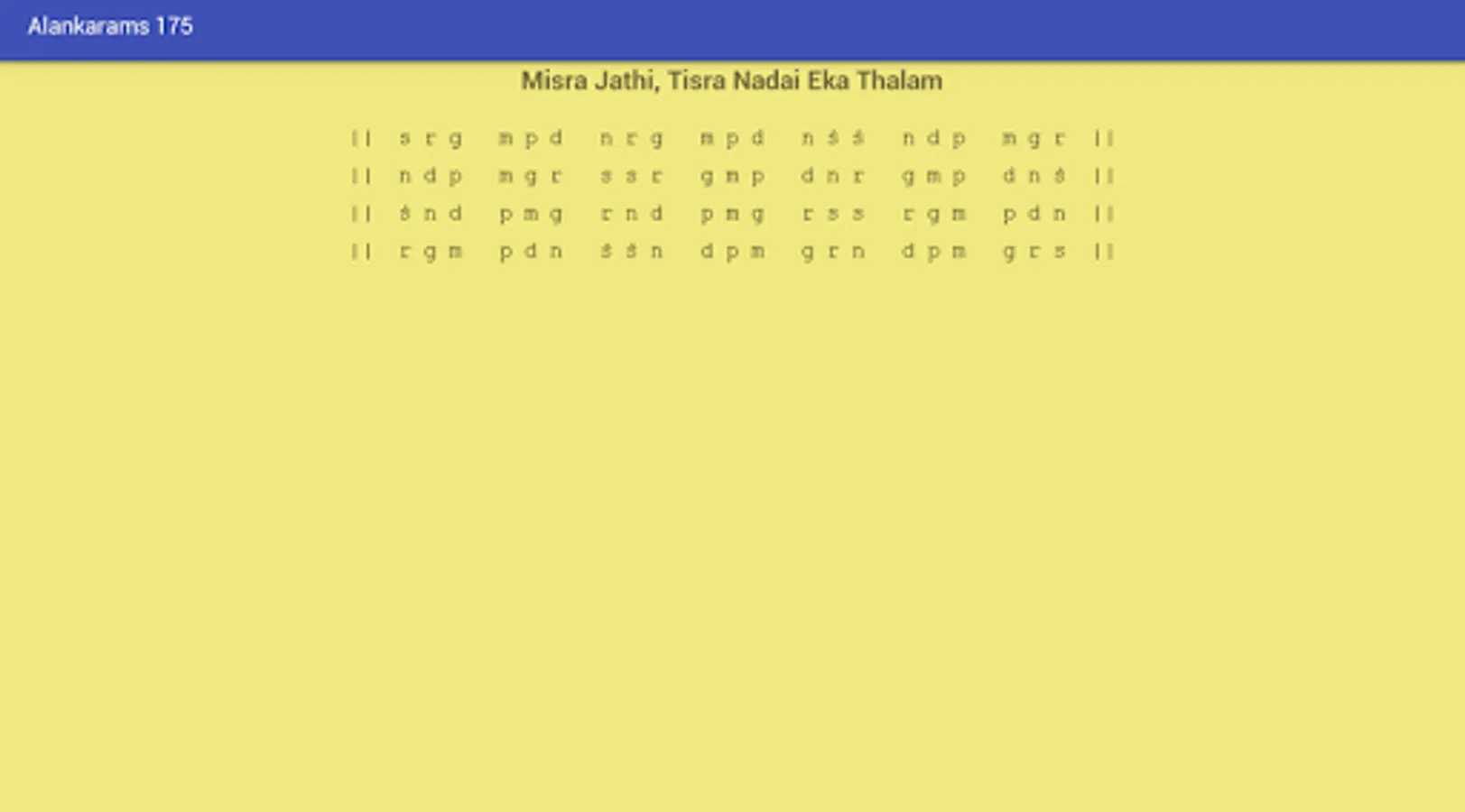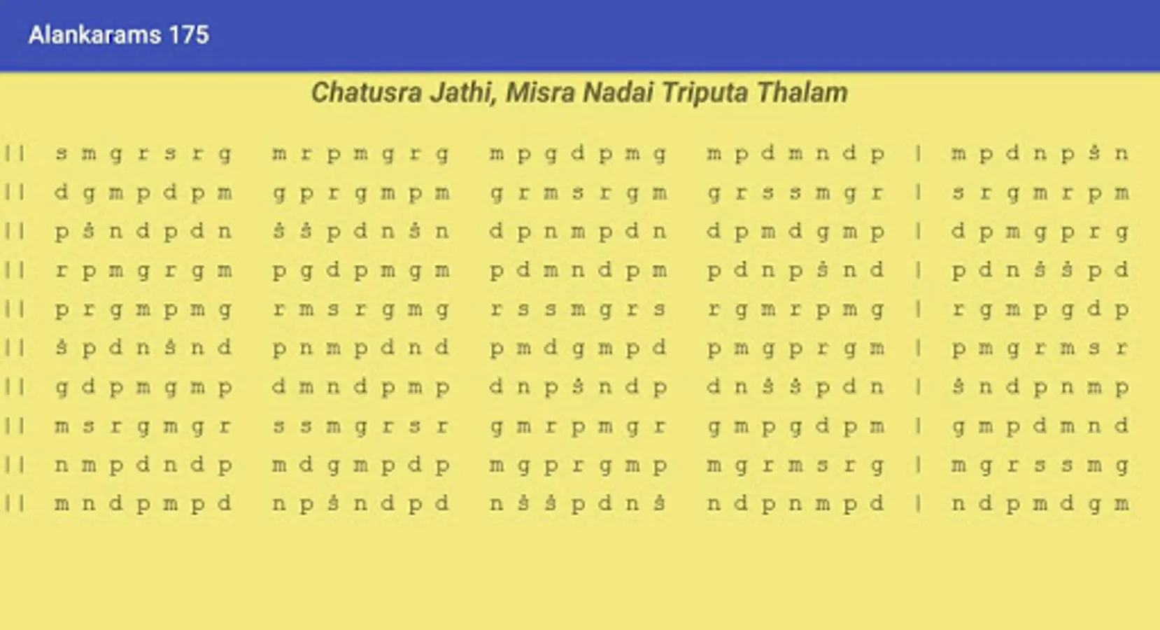 This app allows the user to select a base thalam, a jathi, and a nadai, then displays the corresponding alankaram given the inputs.