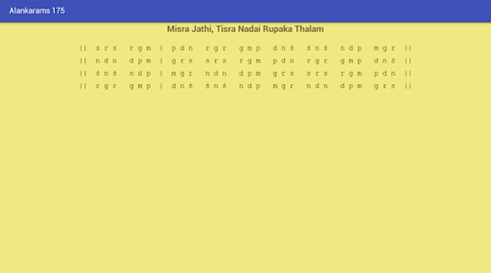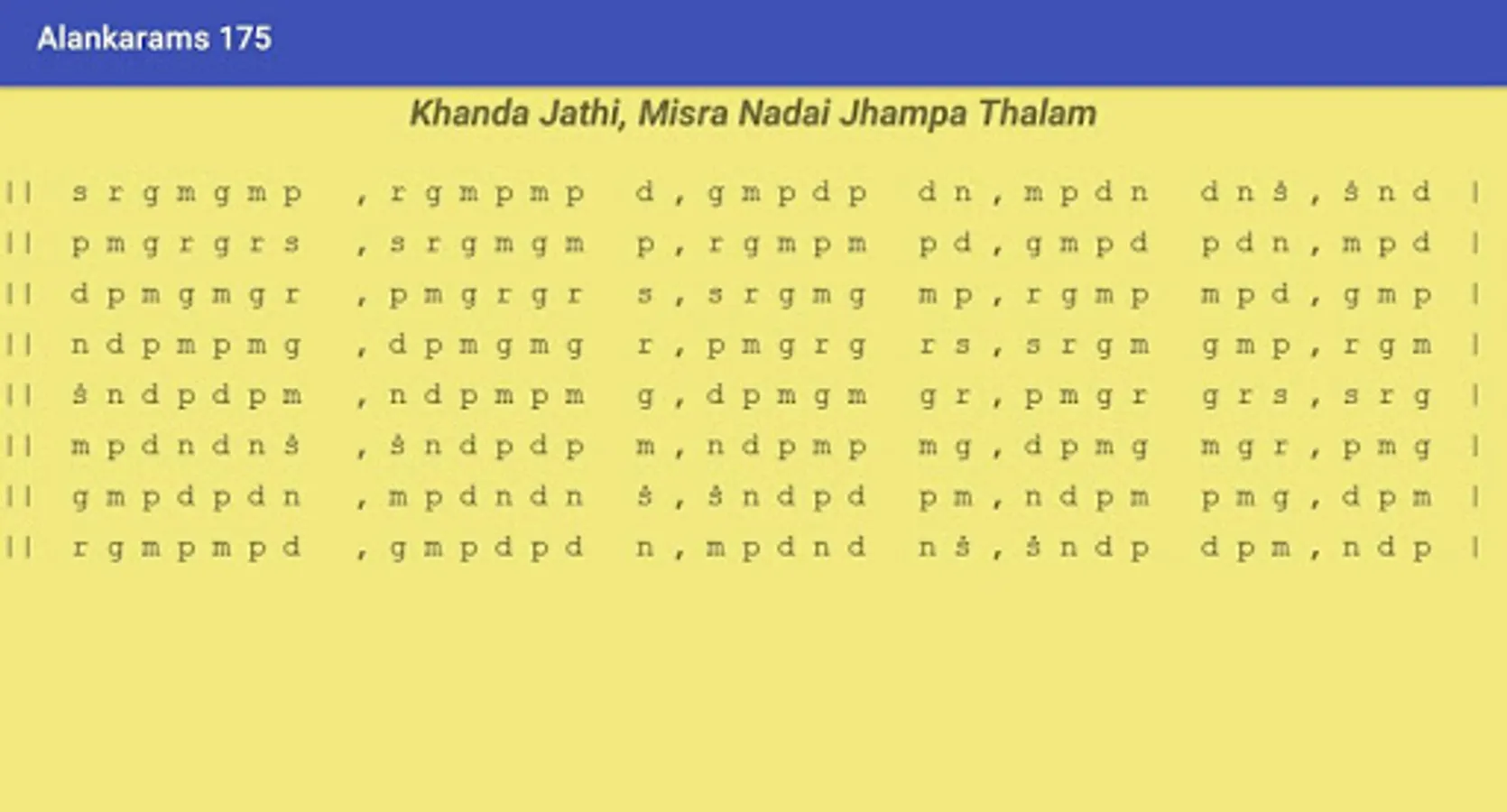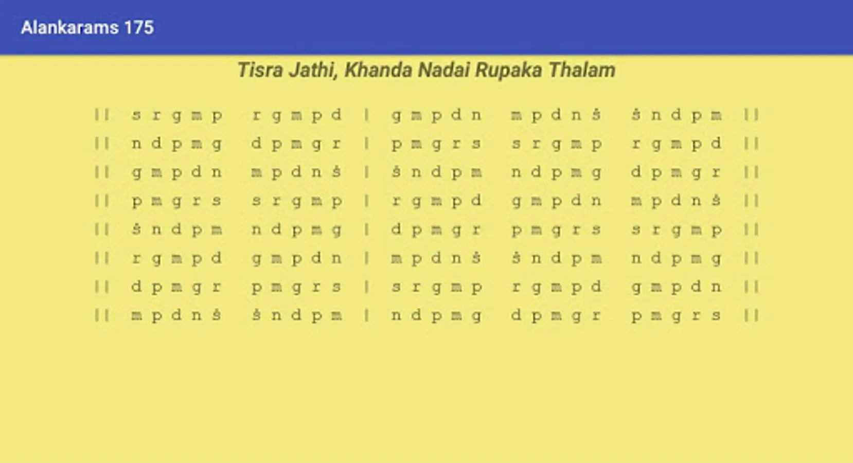 Alankarams are a set of rhythmic exercises that are taught to students of Carnatic Music, a system of music in India. The Alankarams are set in 7 different thalams ( Eka, Rupaka, Triputa, Matya, Jhampa, Dhruva, and Ata thalam).
