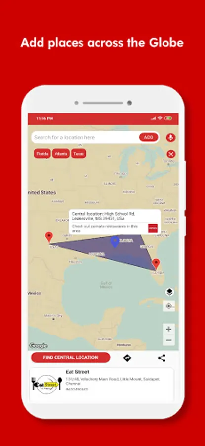 With this app, you can select any number of locations (ie. the location where all of your friends are staying) and it will calculate and display the central location which is equidistant for every one of you. This app has no City, State, Country, or even a Continental border. You name the location, we have the central spot. 🤯