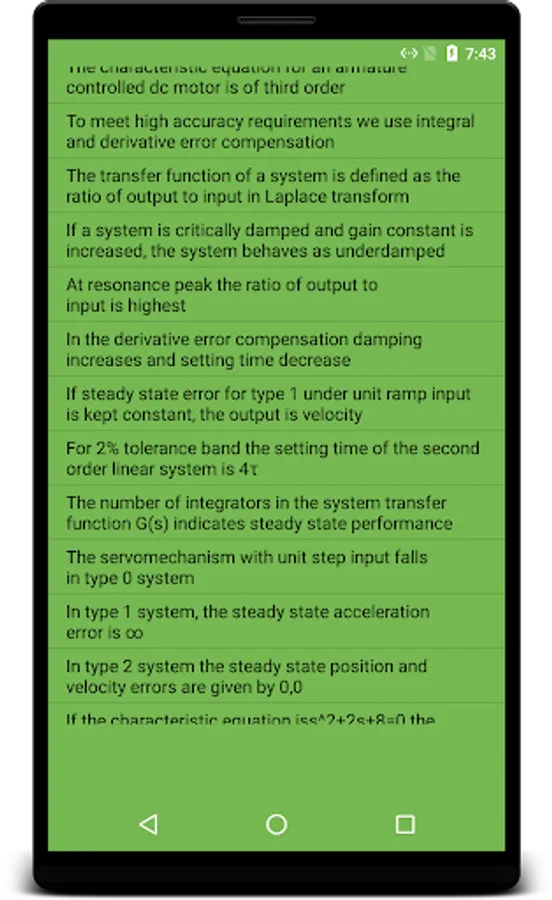 This app contains many MCQs, true/false and fill in the blanks with answers. This study material is great for the students of engineering and also for those who are interested in learning control systems. It is very handy for revising or refreshing your knowledge. The topic covered are Transfer function, z-transform, Open loop and Closed loop control systems, Mathematical modelling of dynamic and linear control systems, Block diagram and signal flow graphs, Time response and frequency response techniques, Transient response, Steady state errors, Stability, Routh-Hurwitz criterion, Nyquist plot, Bode plot and root locus techniques, Compensation and design techniques, State-variable approach.