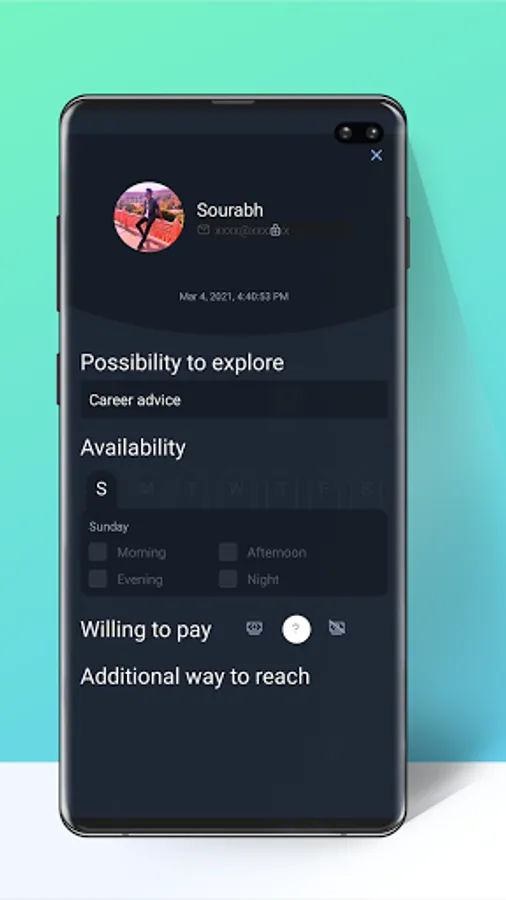 The idea is simple - everyone has some skill or topic of expertise that they can utilize in their spare time for good of others or to earn a little. The app provides a platform for putting yourself out there with a system to explore a possibility with someone else. The more people join in, the more possibilities can be explored. The possibility can be anythhing - from a collaboration to a job of sorts.