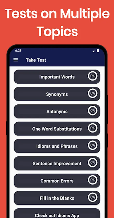 English Vocabulary Test app helps you to learn English Vocabulary in effective way.Vocabulary Builder is an off line application you can learn English words without Internet connection.