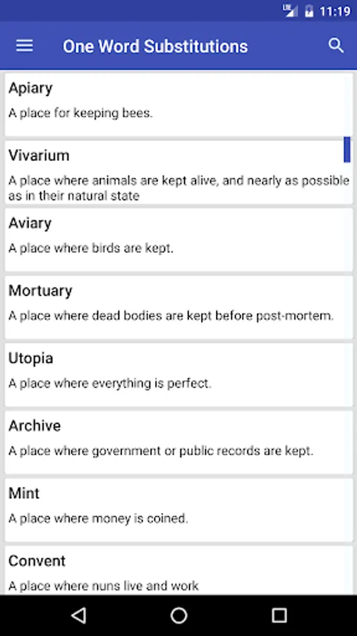 This App has all the important One Word Substitution with explanations and this can be very helpful for improving English Vocabulary.