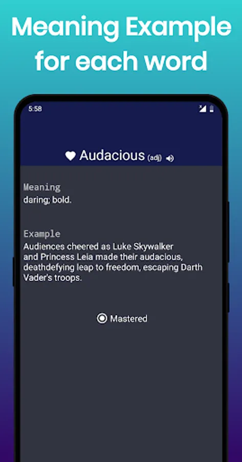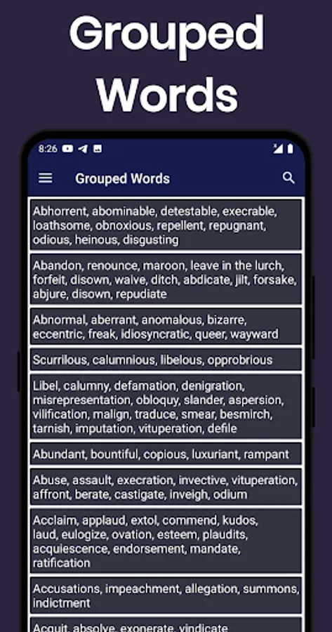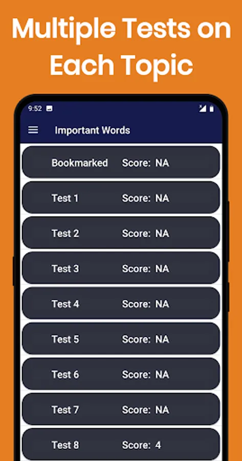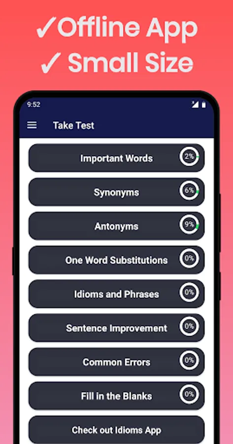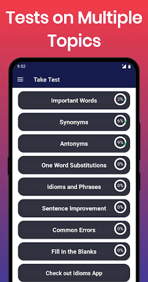This application has several tests on English vocabulary like important words, one word substitutes, synonyms, antonyms, idioms and phrases. By taking tests you can know your knowledge in English words.
