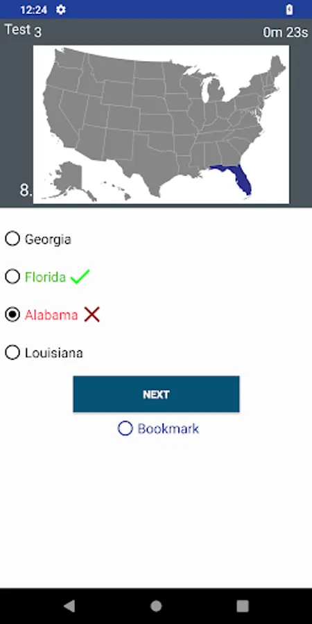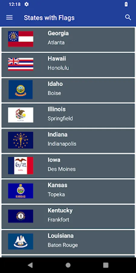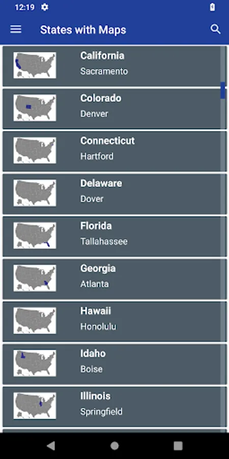 Search for a US State using search bar. This Us States Quiz App has 3 types of quizzes US States and Capitals Quiz, US States Map game, US States Flag Quiz