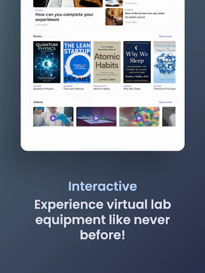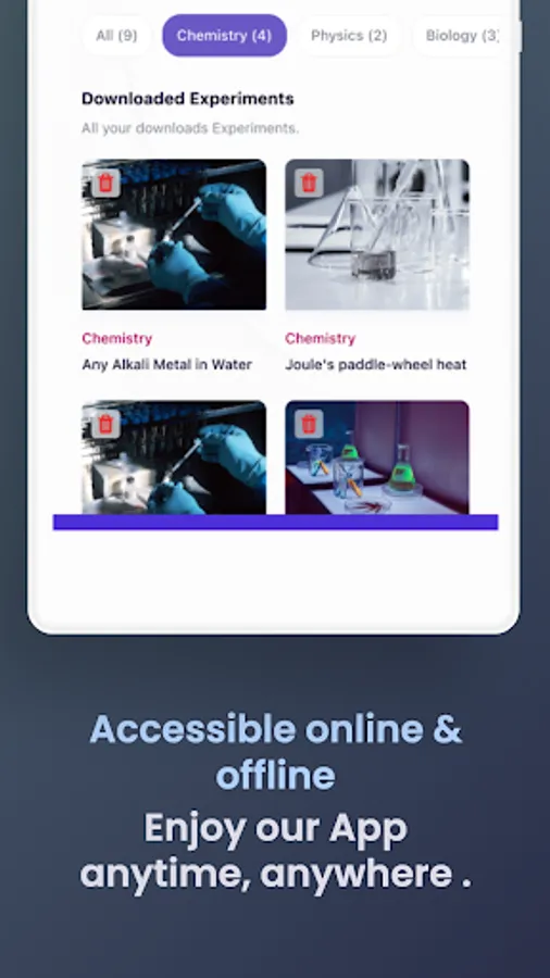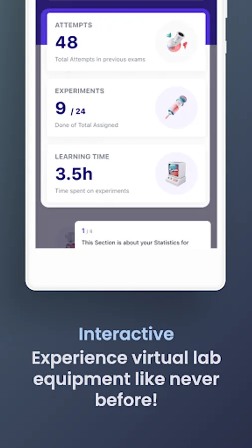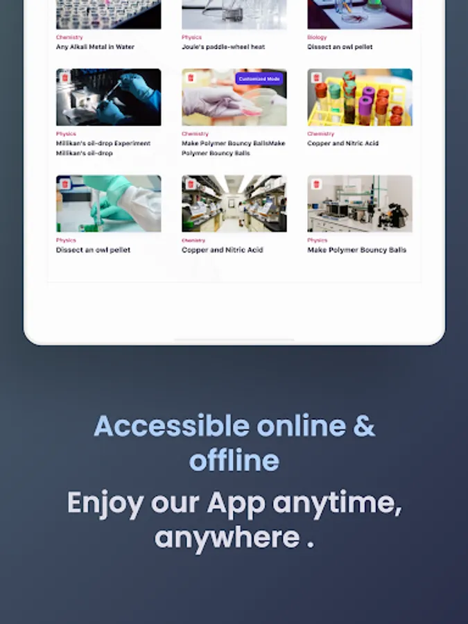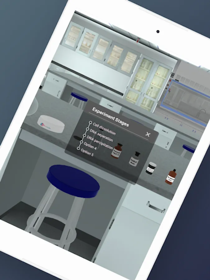 Over 186 interactive experiments in different fields of science, Chemistry, Physics and Biology. The science experiments are conducted in a virtual lab, designed to simulate real-life laboratory environments, complete with state-of-the-art equipment, tools, and instruments.