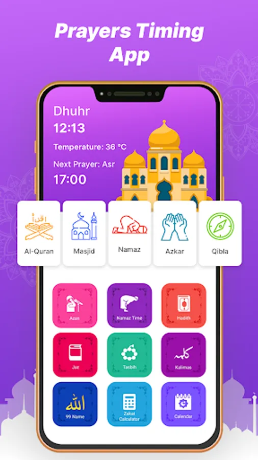 اوقات الصلاة الإسلام في جميع أنحاء العالم الإسلامي أدق أوقات الصلاة وصلاة المسلمين على الأجهزة المحمولة. يتضمن تطبيق مواقيت الصلاة أيضًا القرآن بالكامل مع نصوص عربية وإشارات صوتية وترجمات وتلاوات صوتية إلى جانب محدد القبلة والتقويم الهجري الإسلامي وخريطة للمطاعم والمساجد الحلال وما إلى ذلك وقت الصلاة.