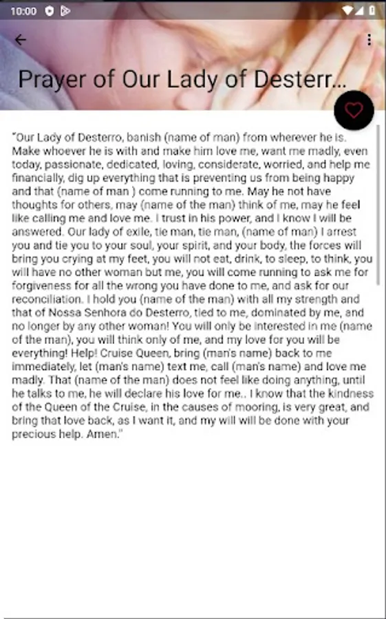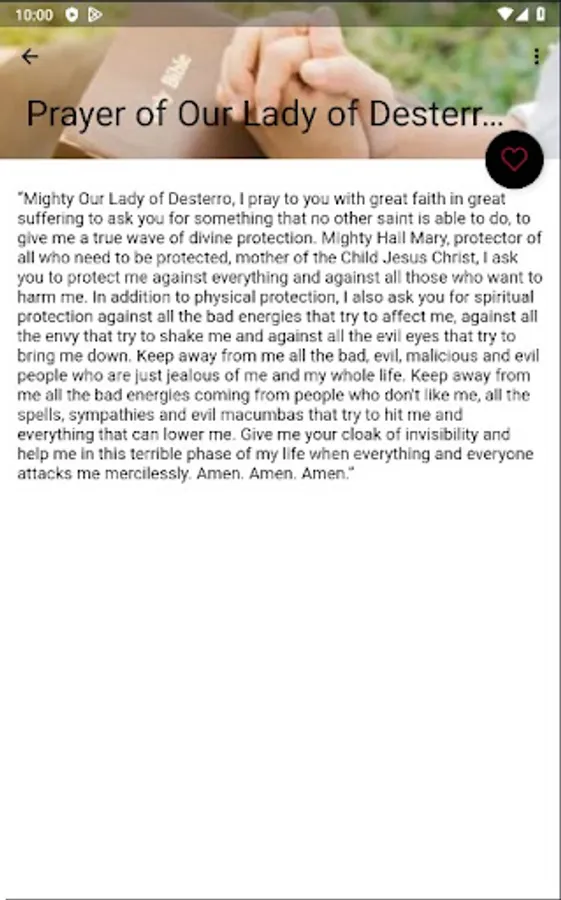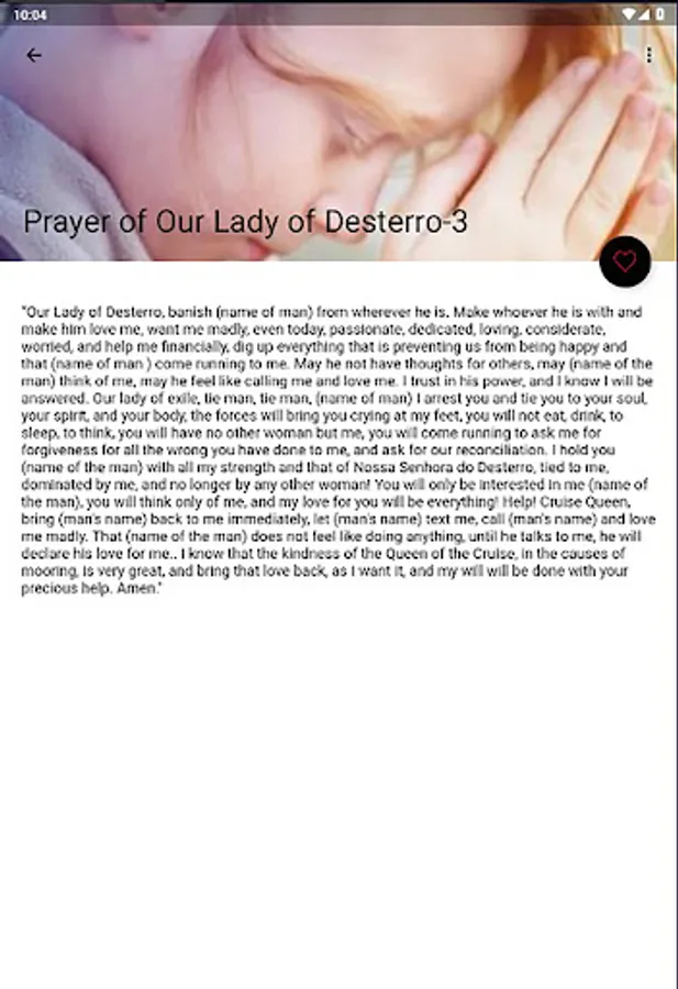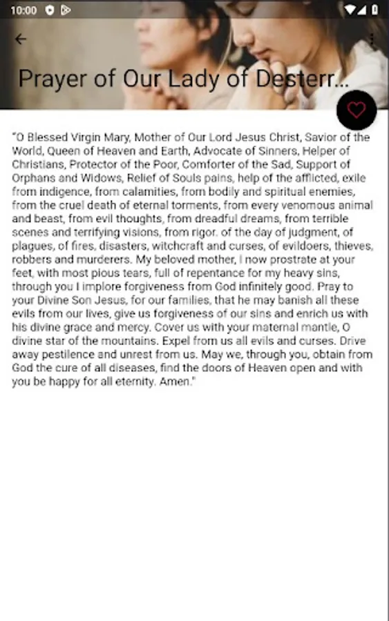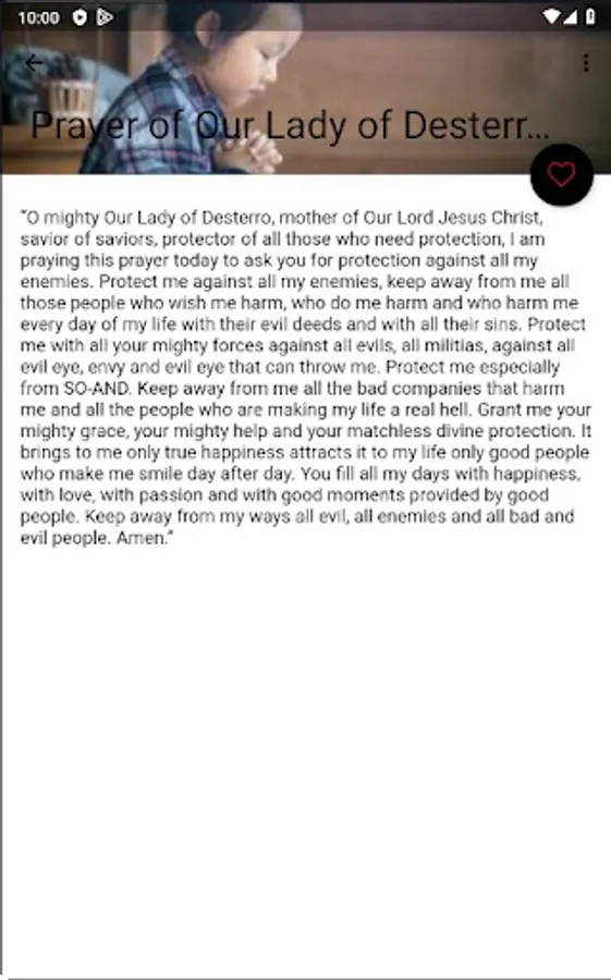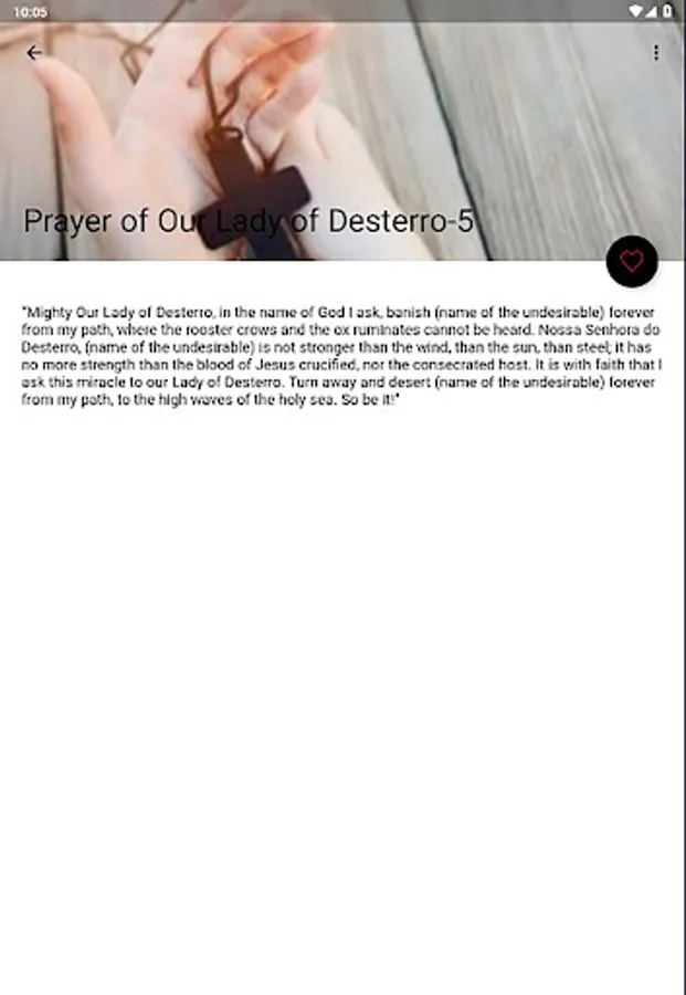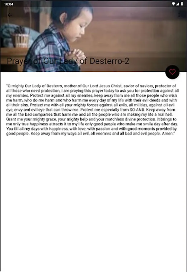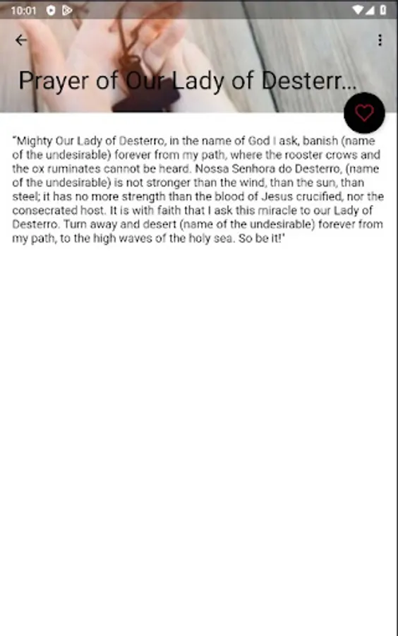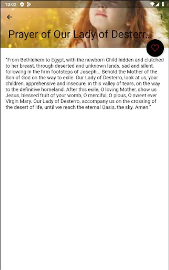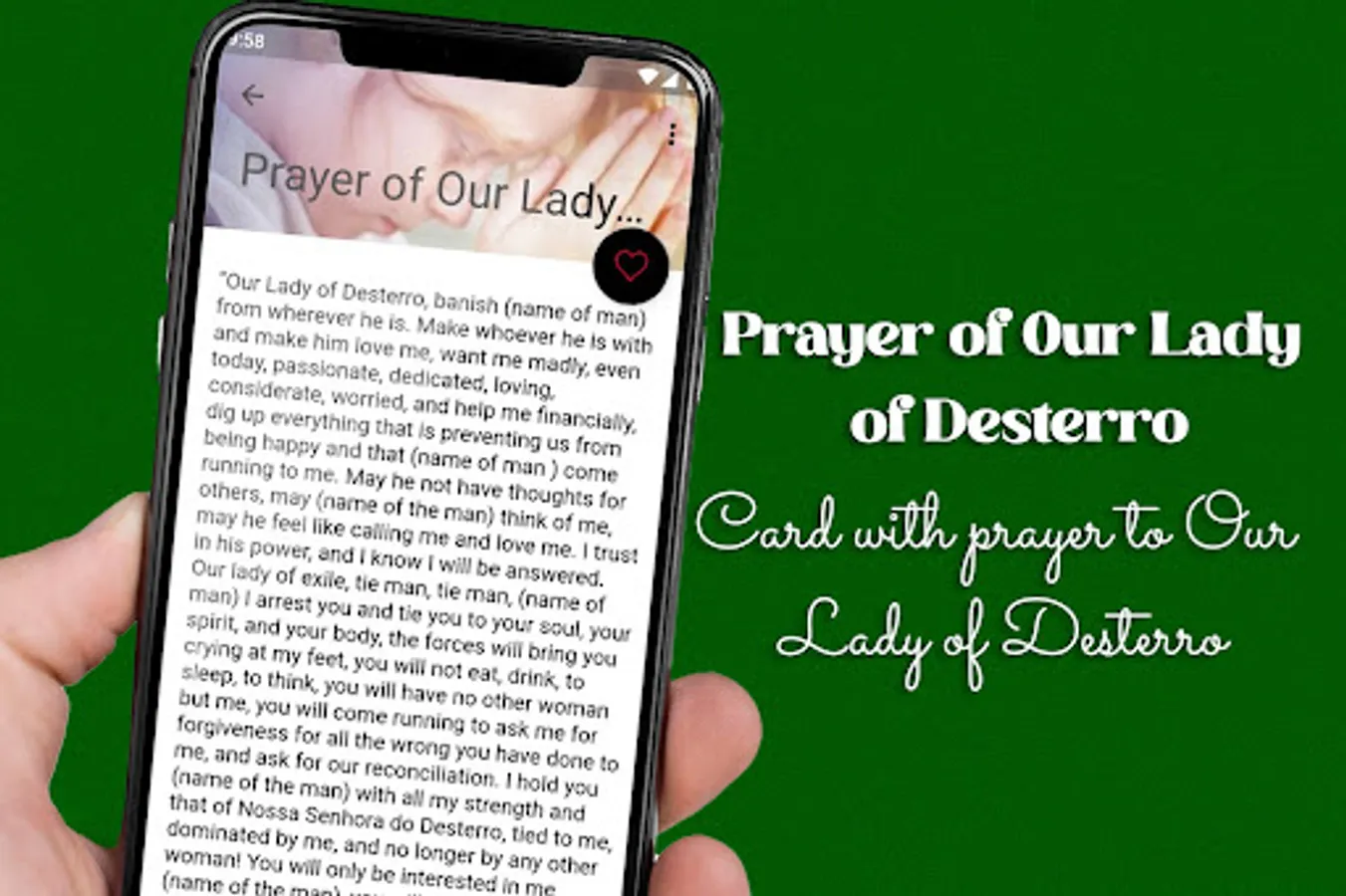 A Catholic traditional exorcism prayer. The Prayer of Our Lady of Desterro is used in an attempt to return the one who has lost their father (or mother) to a state of grace. Our Lady of Desterro is a prayer that the faithful recite when they cannot find their father at the time of death. This is a prayer that reconnects us to the source and draws us closer to Christ's father, who is the source.