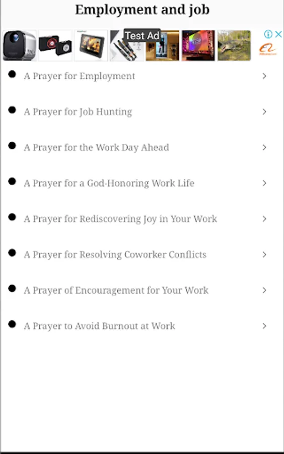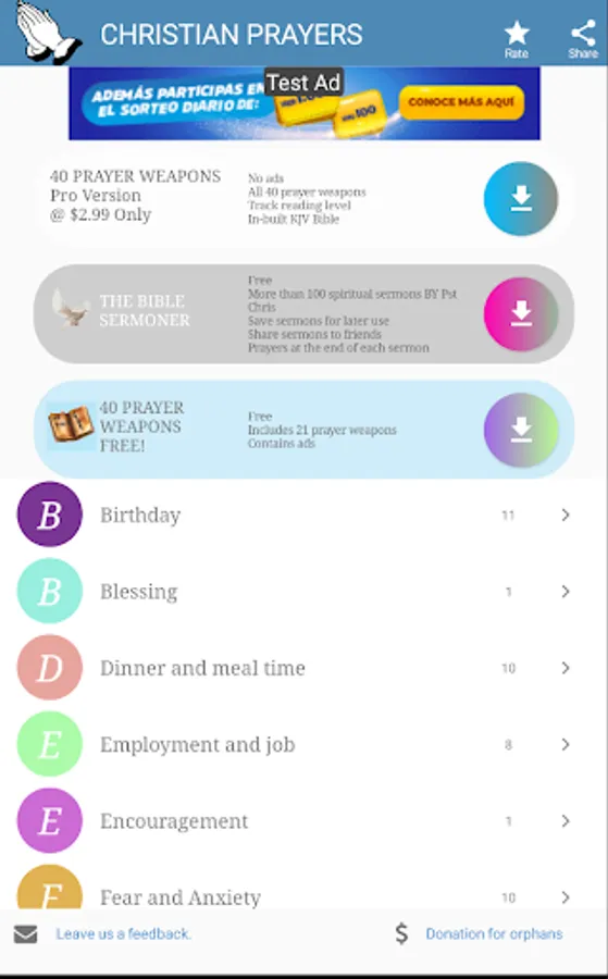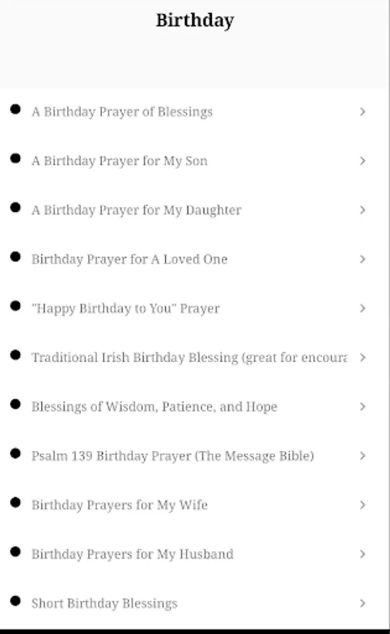 Christian prayers app contains hundreds of prayers in many different categories for instance: birthday, blessings, dinner and meal time, employment and job, encouragement, fear and anxiety, for a friend, for family, forgiveness, guidance and wisdom, healing, mariage, morning prayers, nighttime and bedtime prayers, opening prayers for meetings, peace, prayers from the bible, protection, serenity prayers, short prayers, strength, thankfulness, thanksgiving and The Lord's prayer.