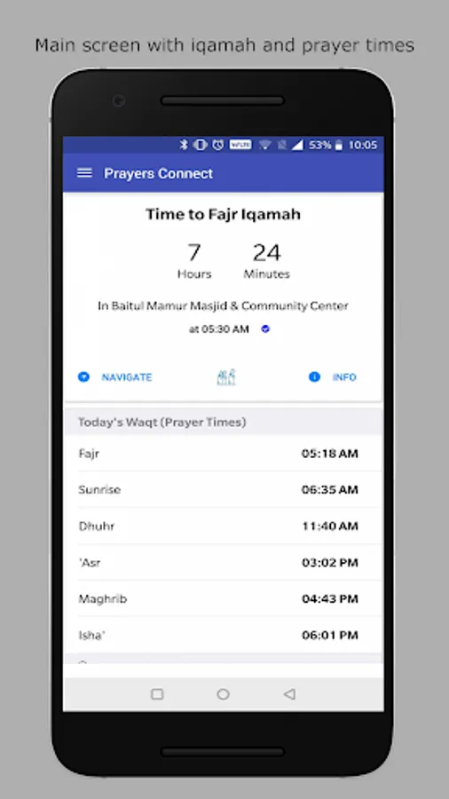 Prayers Connect: Iqamah times, prayers/salat times, reminders and mosque app enables you to catch your prayer (salat) on time in jama’ah (congregation) in your nearby mosques wherever you are within the USA. Find nearest mosque, their iqamah times and reach there with one touch navigation.