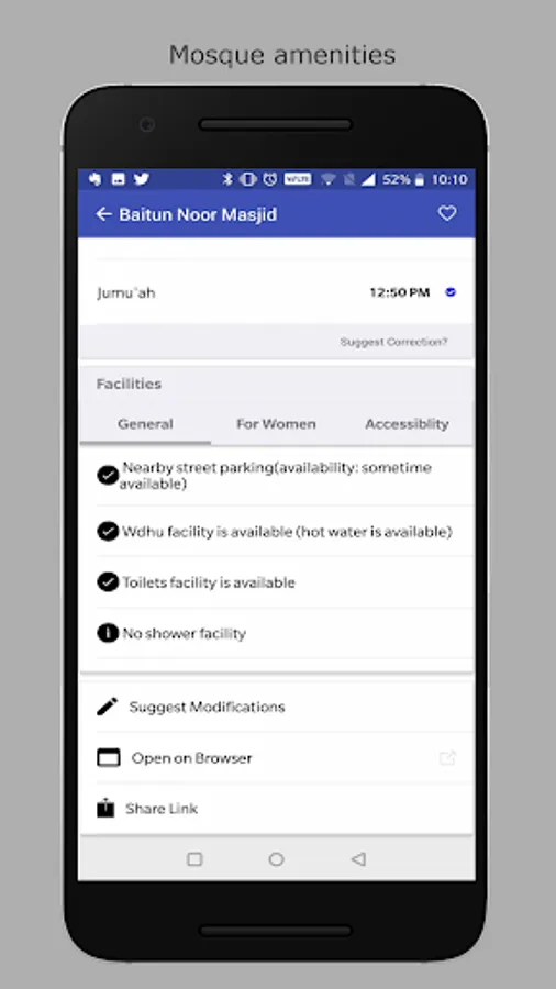● Get informed about the mosque amenities likes parking, wash, restroom, women prayer space and wheelchair accessibility.