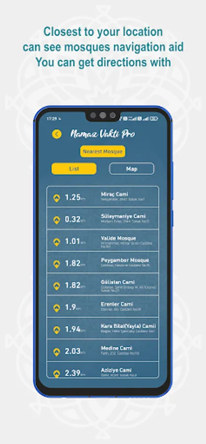 -With the Nearby Mosques section, you can see the closest mosques to your location and get directions with the help of navigation.