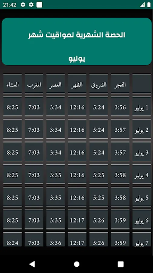 This application does not need the coordinates of your location for prayer timings of your city account. Prayer Time Oman are all available without the expense and the Net and do not Mokhodh from the ministry's website. So through this application put between your hands times for cities in the country and it very quickly and without Internet times.