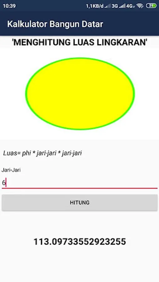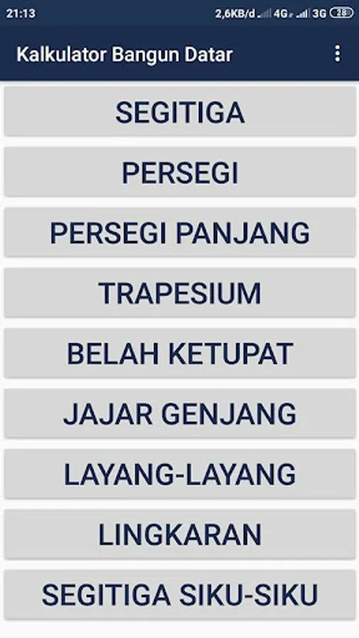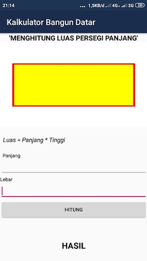 This application I as an exercise to make a simple application. application is used to calculate the area of flat building flat is a term for two-dimensional buildings, such as circles, rhombus, kite, trapezoid, parallelogram, triangle, rectangle and square. Each of these constructs has a formula for calculating the area and circumference that differ from one another.