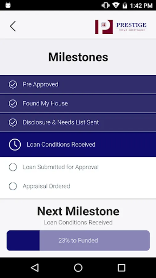 The Prestige Home Mortgage app allows all 3 parties (home buyer, loan officer, real estate agent) to track the progress of the home loan application process as the Home Buyer meets the milestones and conditions required to get final approval.