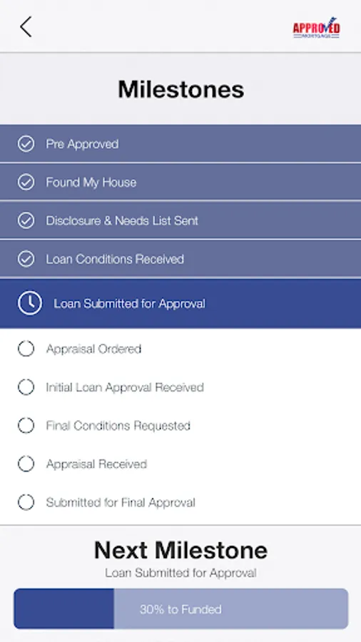 The Approved Mortgage Source app allows all 3 parties (home buyer, loan officer, real estate agent) to track the progress of the home loan application process as the Home Buyer meets the milestones and conditions required to get final approval.