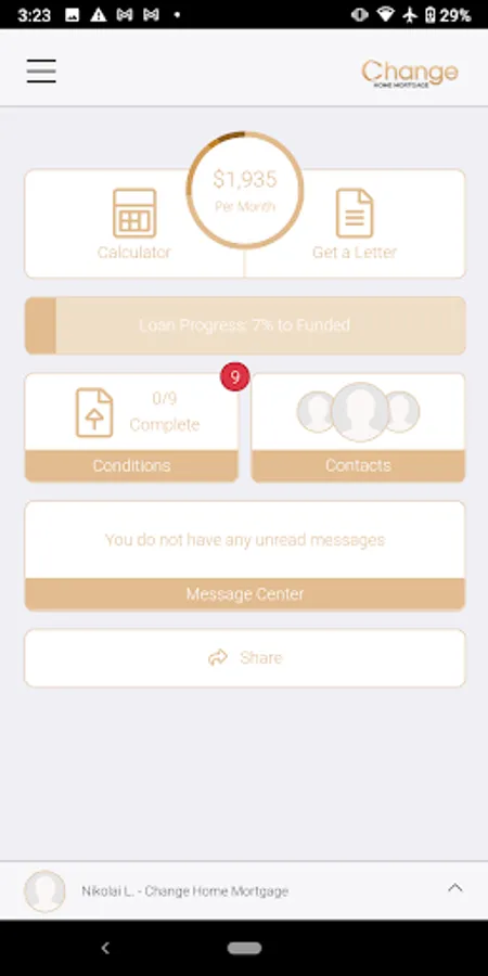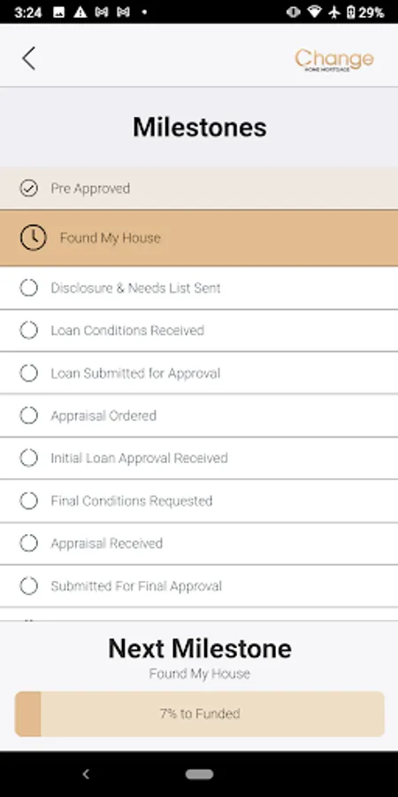 The Change Home Mortgage app allows all 3 parties (home buyer, loan officer, real estate agent) to track the progress of the home loan application process as the Home Buyer meets the milestones and conditions required to get final approval.