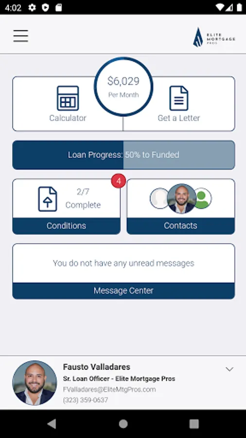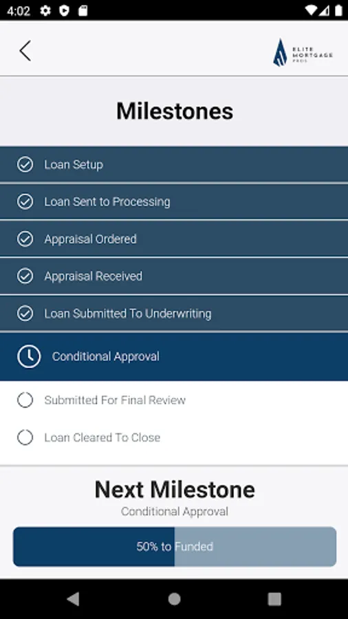 The Elite Mortgage Pros app allows all 3 parties (home buyer, loan officer, real estate agent) to track the progress of the home loan application process as the Home Buyer meets the milestones and conditions required to get final approval.