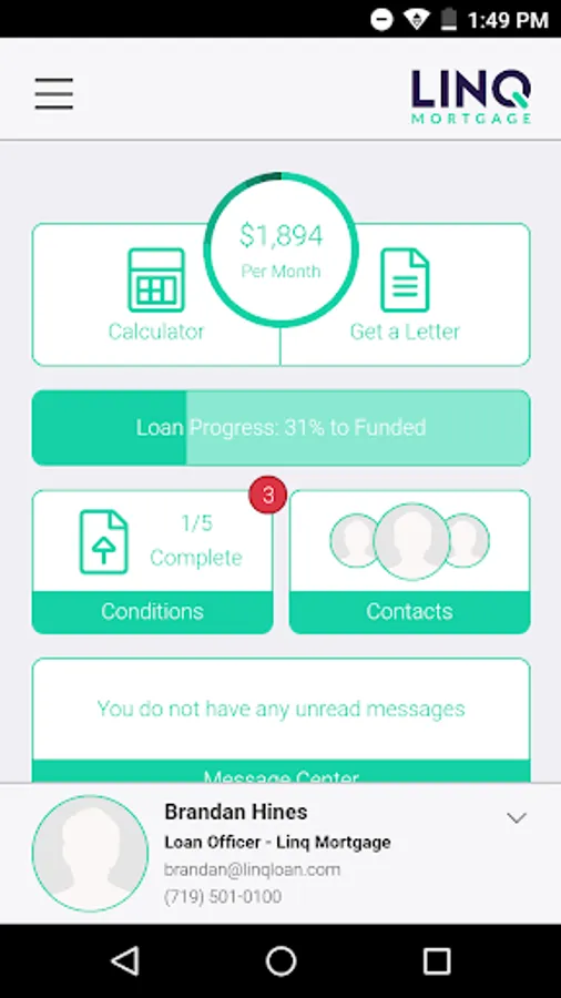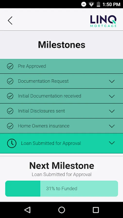 The LINQ Loans app allows all 3 parties (home buyer, loan officer, real estate agent) to track the progress of the home loan application process as the Home Buyer meets the milestones and conditions required to get final approval.