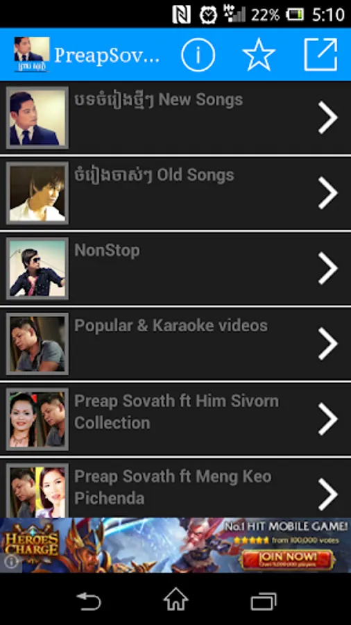 Preap Sovath is a singer in Cambodia. He records for Cambodian production company Rasmey Hang Meas. Preap Sovath is the pop singer who can sing like the romantic, love and so on. This App will allow you to listen and watch to his songs.