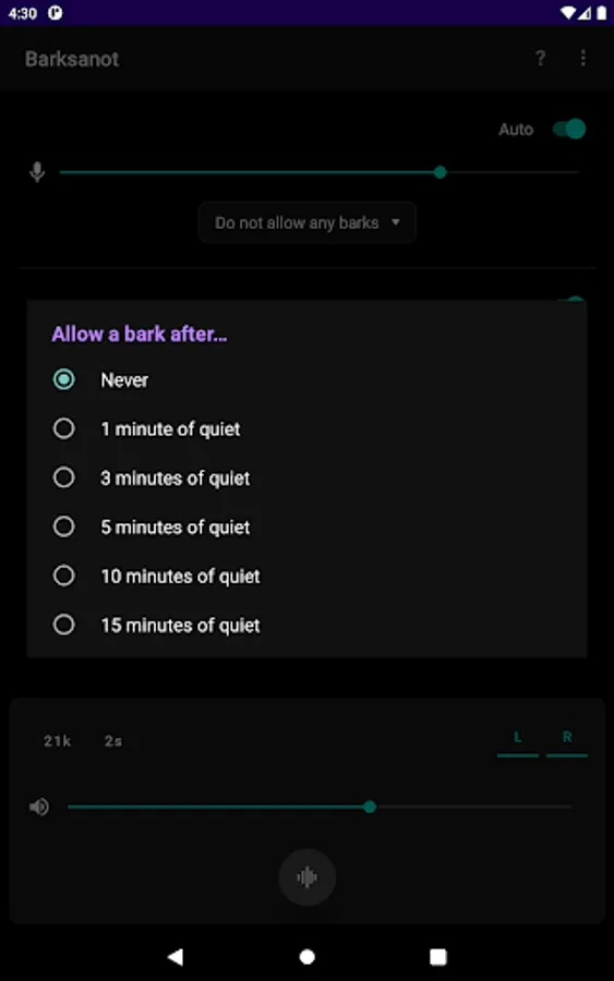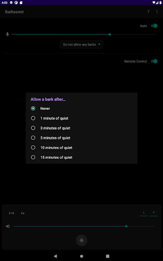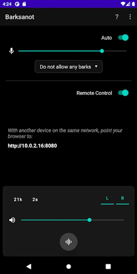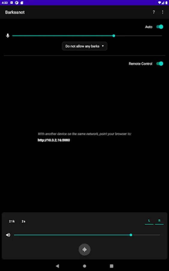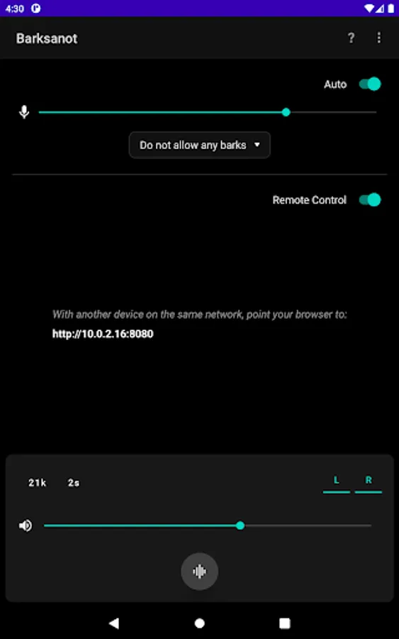 Barksanot can also serve a webpage for remotely controlling it from another device on your same network. For example, if you have an old Android (version 5.1 or higher) phone or tablet you don't use anymore, you can install and run Barksanot on it, leave it plugged in near the dog, and then control it from a browser on your regular smartphone or computer. Simply visit the URL listed on the Barksanot main screen and you can access a web interface to adjust the Barksanot settings.
