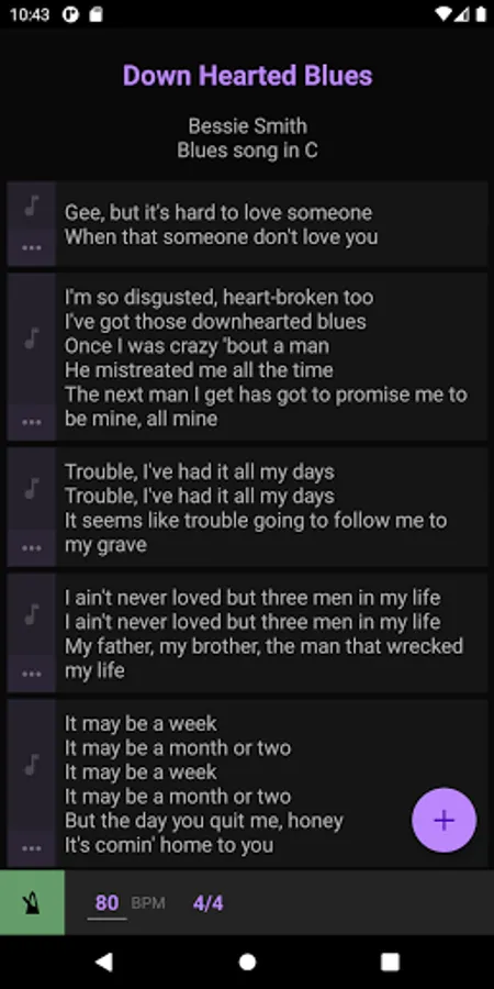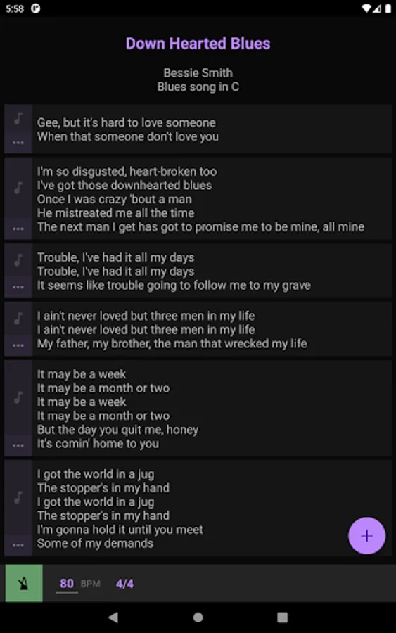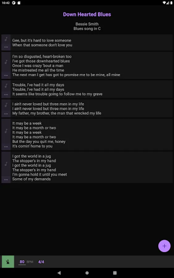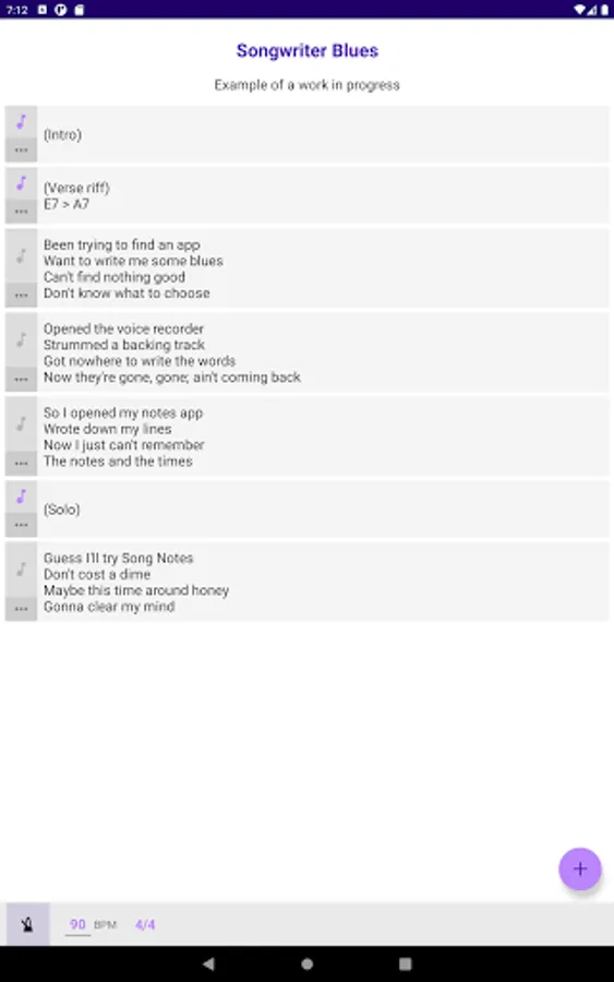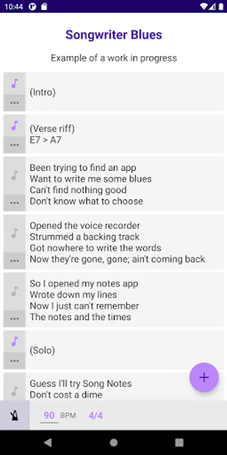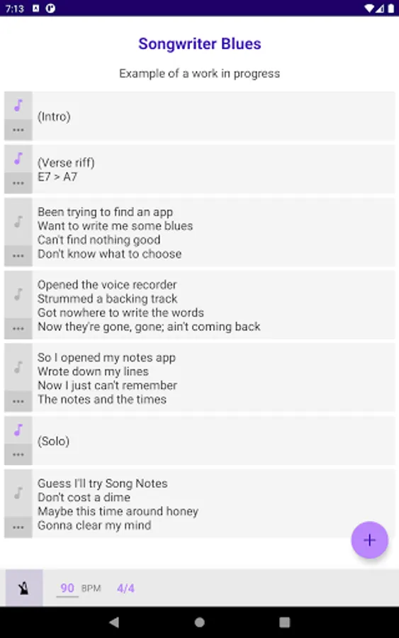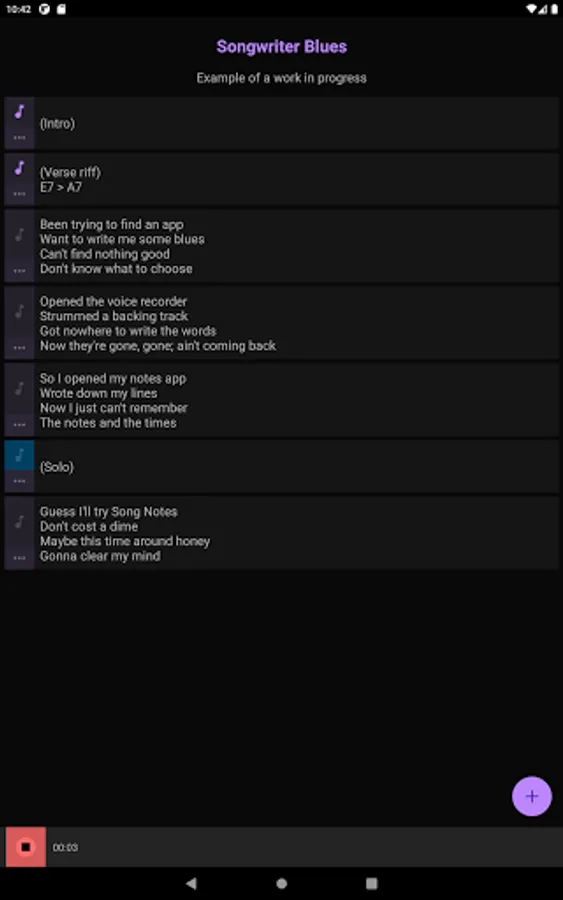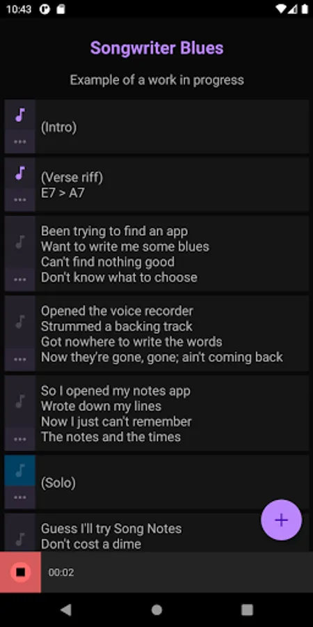 Song Notes helps you organize your song ideas better by combining a simple audio recorder with a musical notebook. Whether you like to start with the music or the lyrics, or work on both in parallel, we've got you covered. Just create a new song, add some fragments to it and start filling them with your ideas.