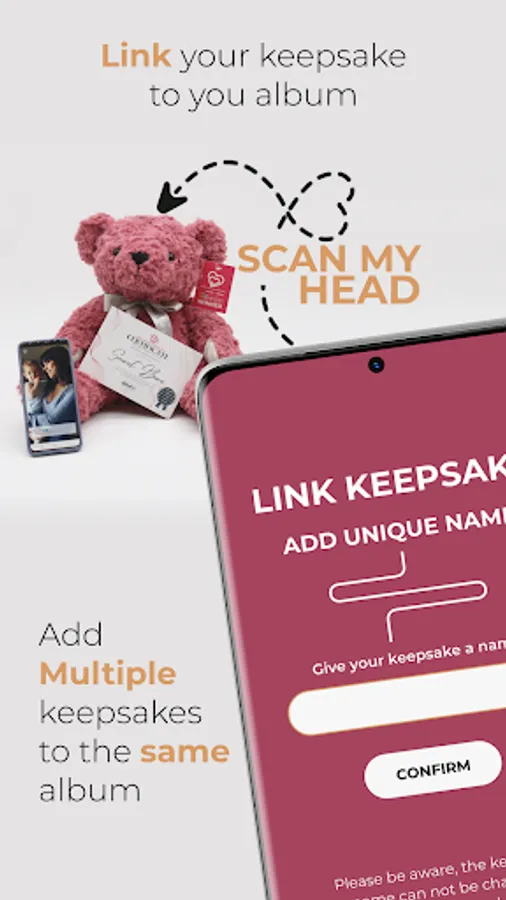 It's really simple, once you have registered to the Precious Memories app, create your first album and link your keepsake/s to that album. Once you have done this you will be able to scan the keepsake which will open up the linked album..