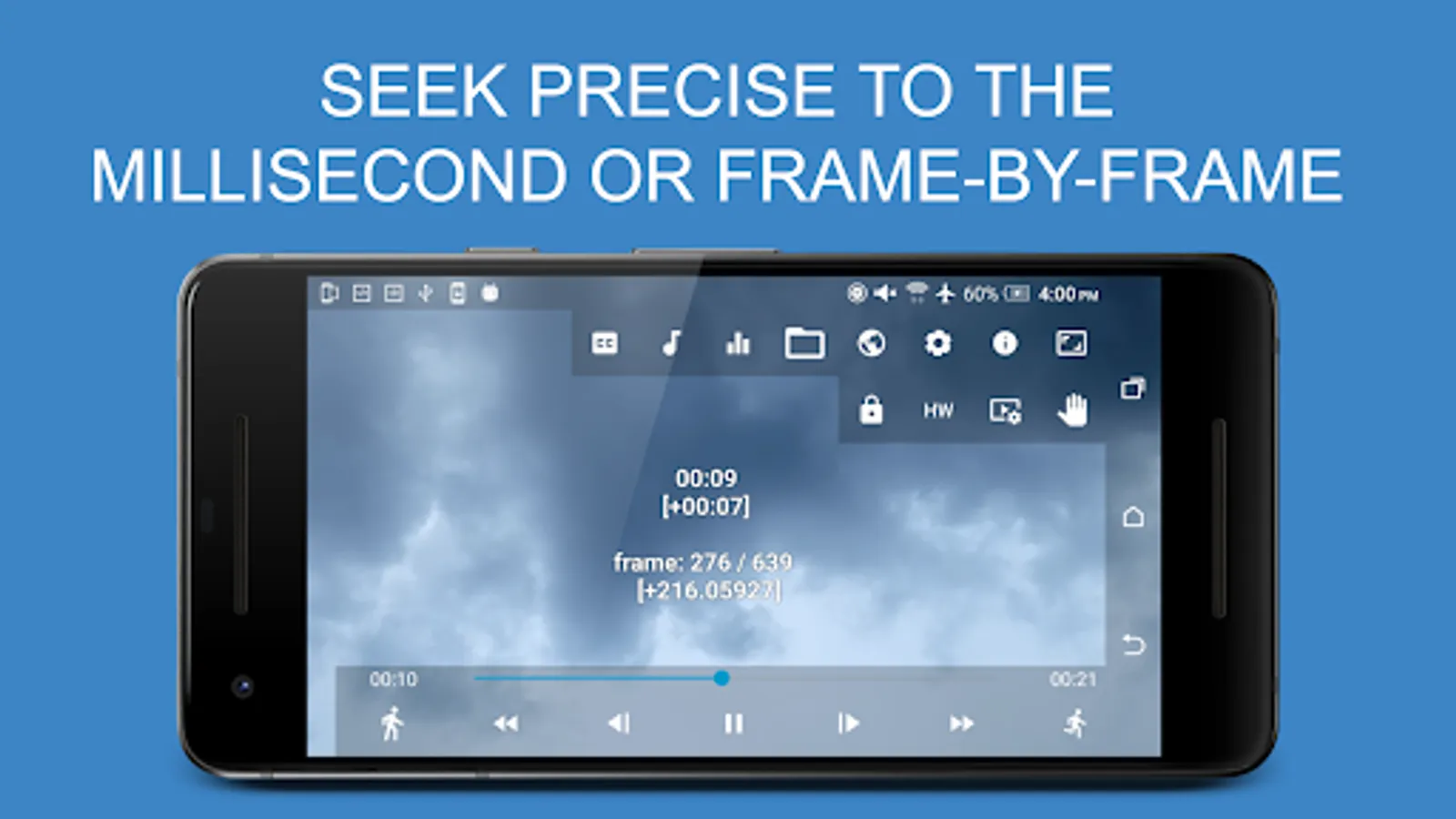 Ad-free video player for android with rare features not found in most popular players. Focuses on precise control of the playback such as volume level, video seek, etc.