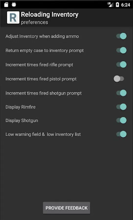 Preferences include the ability to turn off auto-adjust inventory (useful when first entering your inventory so adding already loaded rounds doesn't impact your component stock), whether or not you want to see the prompt to return brass to inventory, as well as the ability to separately control rifle and pistol brass for auto-increment times fired.