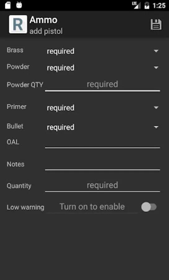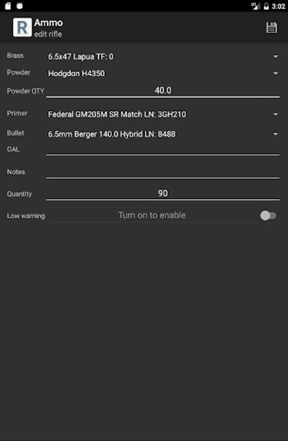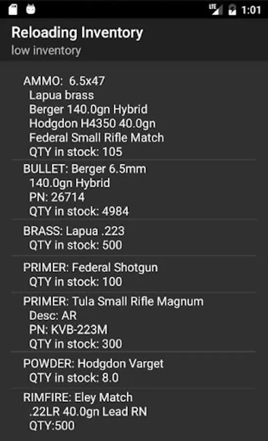 Also included is a "Low Inventory" list. This can be turned on/off in preferences as well. When enabled, a field is displayed on each item (ammo, brass, bullet, powder, primer, and Rimfire) that allows you to define a "low warning" number. Once you've entered your entire inventory, turn on "Adjust Inventory when adding ammo" and your inventory of primers, bullets, brass, and powder will automatically be reduced the proper amount when you increase the quantity of Ammo. Ammo will be reduced when you select "shoot". As the inventory is being adjusted and kept track of for you, if the quantity of any of the configured components falls below the configured "low warning" number, it will automatically be added to the "Low Inventory" list. This makes shopping even easier, since you don't have to dig through your entire inventory to know what you're low on!