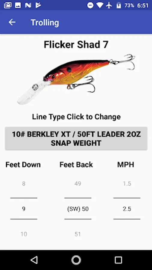 The new Precision Trolling Data App allows anglers to access a wealth of trolling data. The familiar “Dive Curves” made popular in the Precision Trolling book are now incorporated into easy to use “pickers” or “wheels”. The Data Wheels let you adjust the “feet down” to determine the “feet back”. This is particularly useful if you want to target fish at a certain depth that you are seeing on your sonar unit. The Data Wheel also allows anglers to adjust the “feet back” to determine the “feet down” that the lure will dive. This a fast and effective way of zeroing in on a target depth with any of the lures or diving devices included in the Precision Trolling app.