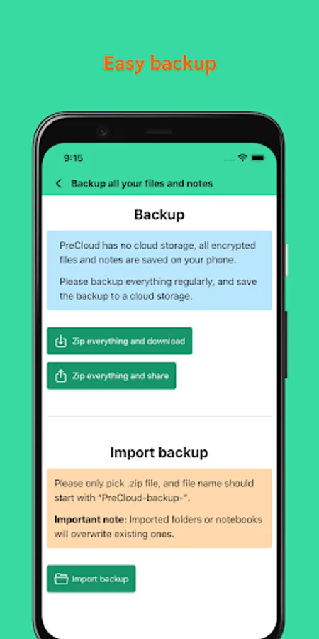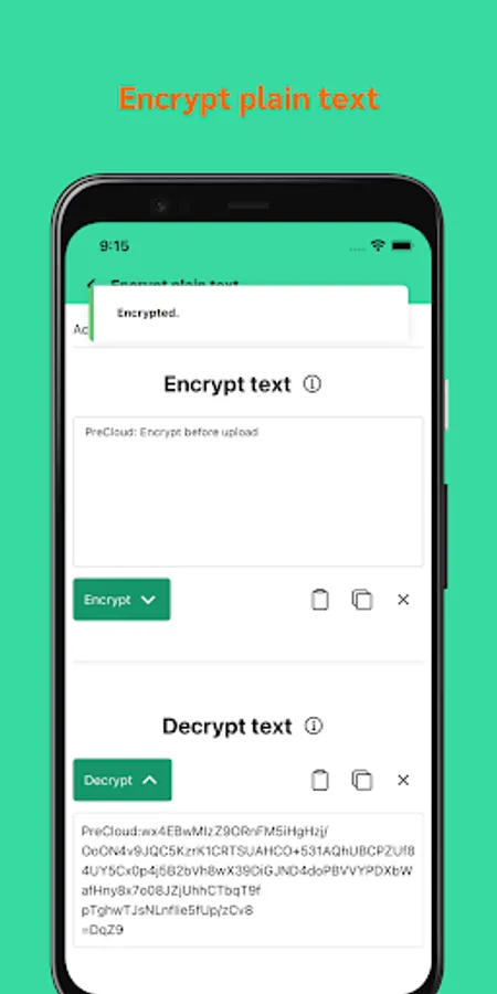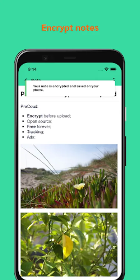 PreCloud has no server, everything happens on your device: your passwords, the encryption process, the encrypted files and notes.