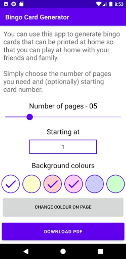 The app will produce books with six cards and 3 books to each A4 page. Choose a background colour for your books and optionally up to 20 pages (60 books). You can optionally specify a starting card number.