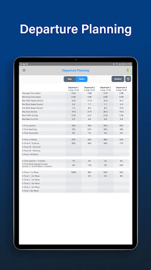 Departure Planning quickly summarises the weather conditions you’ll encounter along your route if leaving on day 1, 2, 3, or 4. Use this data to select the perfect departure date, every time.