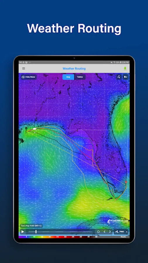 Weather Routing takes your start and end points then calculates your route factoring in tides, currents, wind and wave data, depth and your boats unique dimensions to give you the best route for comfort or speed.
