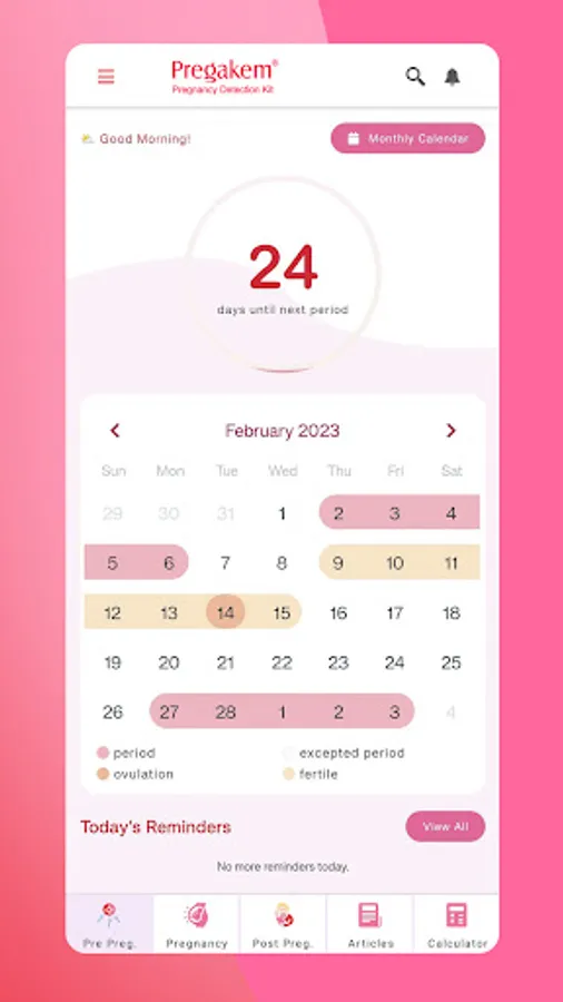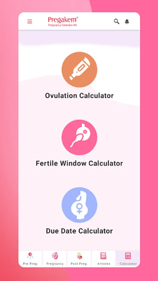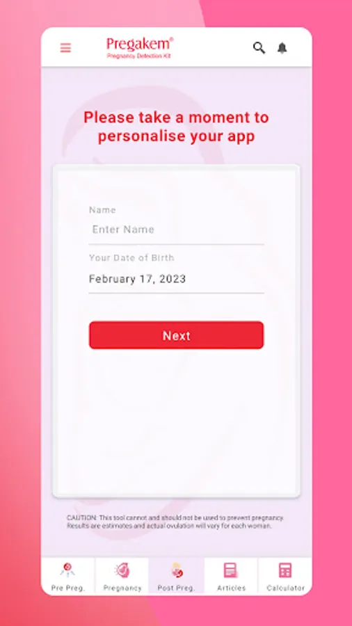 Calendar – You will find this feature in Pre-Pregnancy tab. The monthly calendar will show your menstrual cycle calendar. You just need to fill in the details such as your name, your date of birth, your average menstrual cycle, what was your last period start date and how many days your period lasts. Filling in this information will help the calendar to calculate the days until your next period, your fertile window and the day you start ovulating.